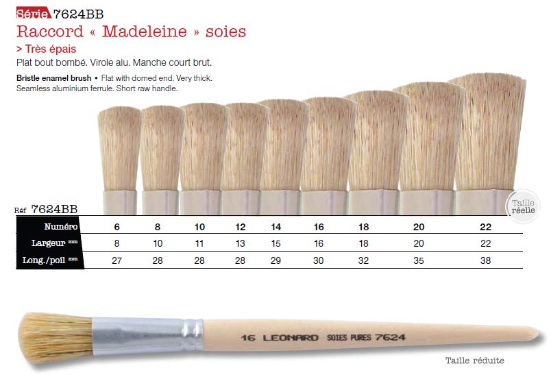 Penseel in varkenshaar, zgn raccord 'Madeleine'. Plat en afgerond. Zeer dik. aluminium huls. Korte ongelakte steel.